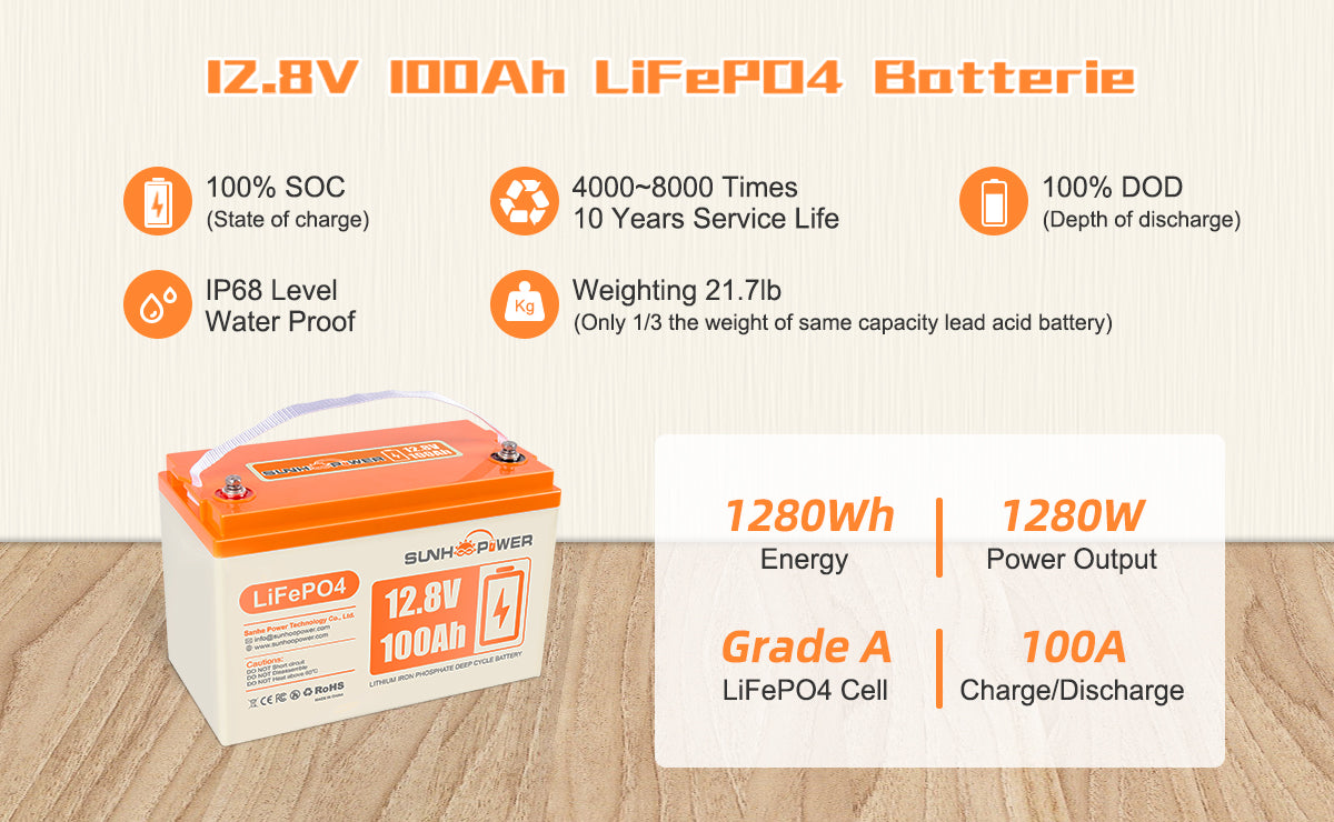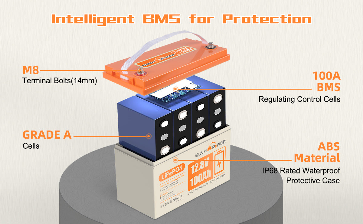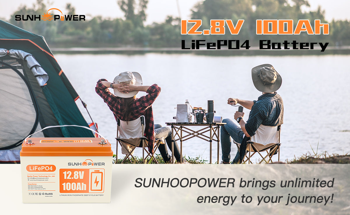 SUNHOOPOWER 12.8V 100Ah LiFePO4 Battery, Bulit-in 100A BMS, 1280WH Energy