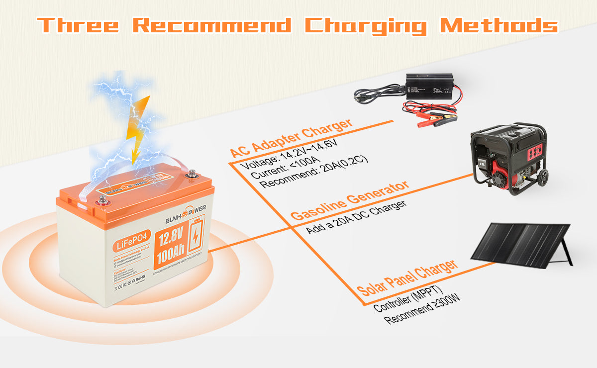 【WARNING NOTICE】SUNHOOPOWER 12V 100Ah LiFePO4 battery is recommended for use with 30 to 70 lbs trolling motor. LiFePO4 battery is storage batteries and not starter batteries, we do not recommend using the Battery as a starter battery or to power any golf cart, for more info please consult SUNHOOPOWER freely.