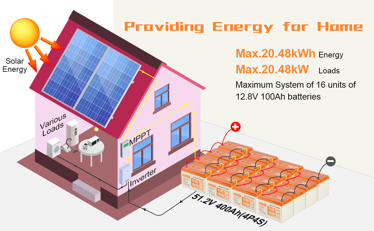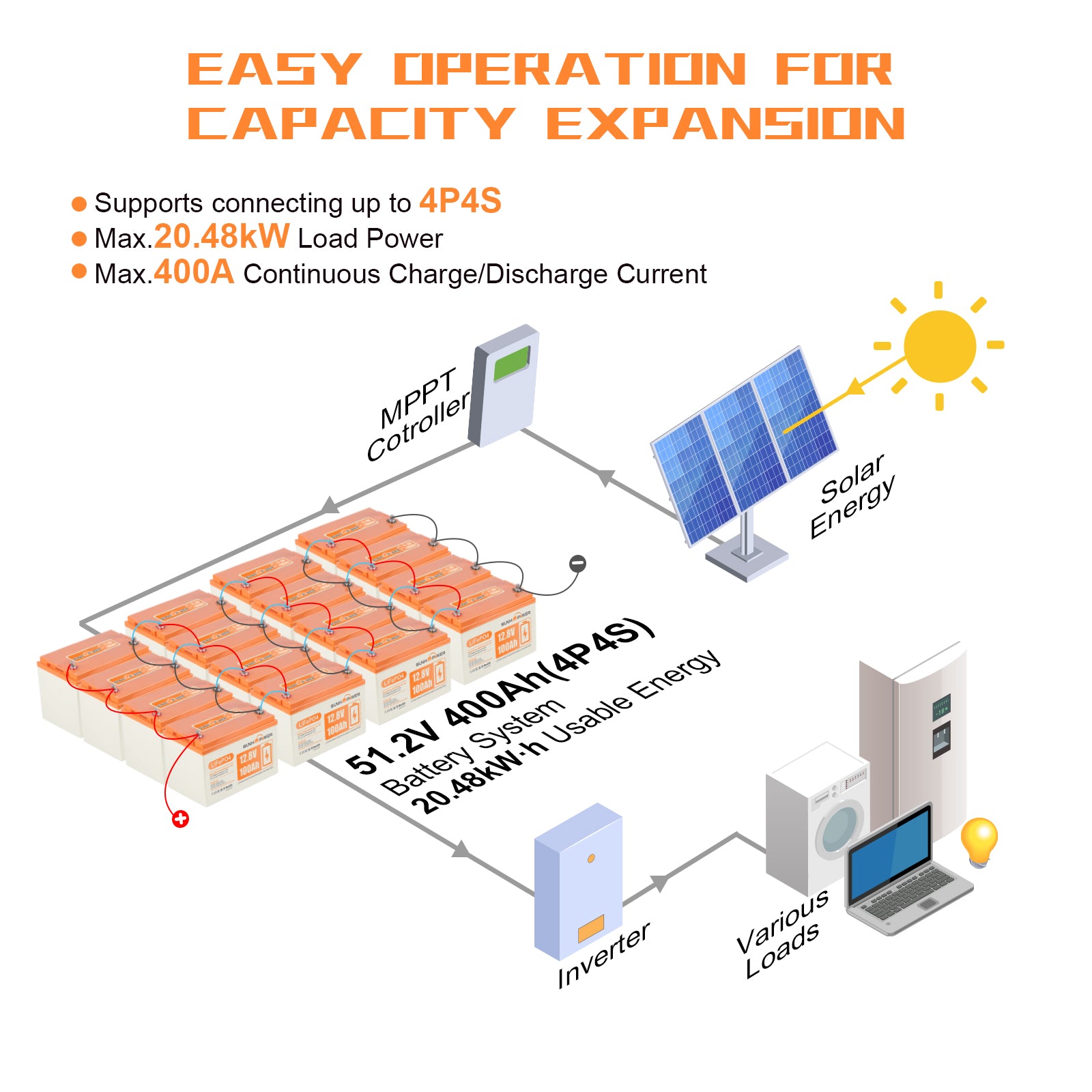 【Capacity Expansion】SUNHOOPOWER 12V 100Ah lithium batteries can be connected in parallel and series for greater capacity and voltage. Maximum Series Capacity: Up to 4 identical batteries can be connected in series, voltage up to 48V. Parallel: Multiple batteries can be connected, it is recommended to connect no more than 4 batteries in parallel. Allows expansion to 4S or 4P for up to 400Ah capacity or up to 48V(51.2V).