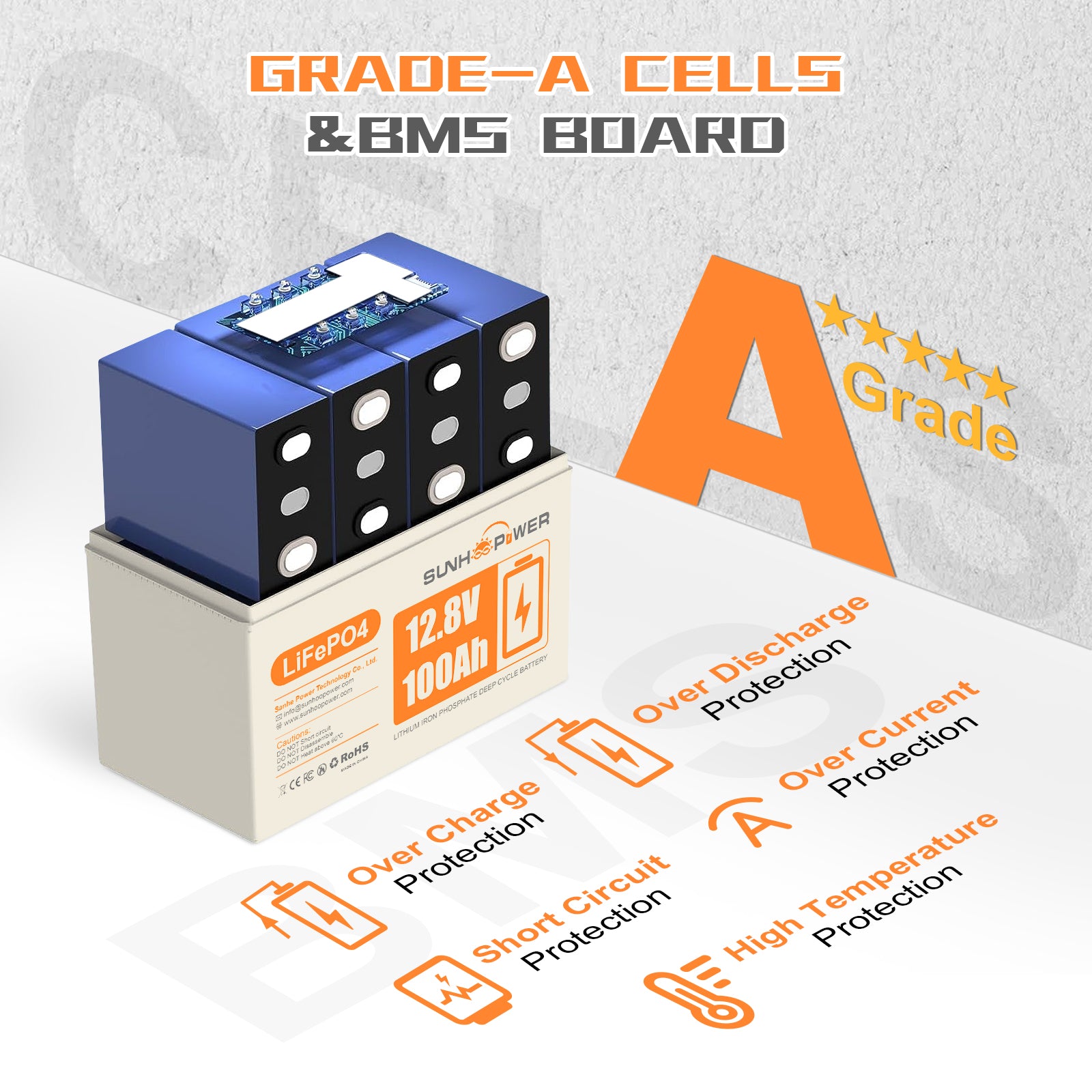 【Bulti-in 100A BMS】12V 100Ah LiFePO4 battery built-in 100A BMS (Battery Management System) which can protect it from overcharge, deep discharge, overload, over-current, over-heating and short circuit.