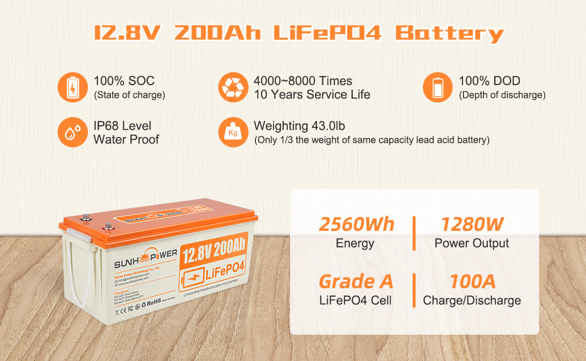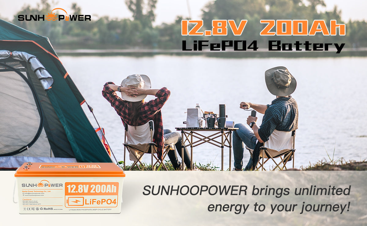 SUNHOOPOWER 12V 200Ah LiFePO4 Battery, Built-in 100A BMS, 2560Wh Energy
