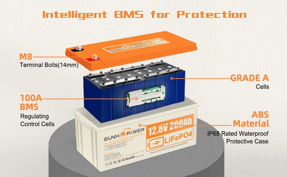 【Bulti-in 100A BMS】12V 200Ah LiFePO4 battery built-in 100A BMS (Battery Management System) which can protect it from overcharge, deep discharge, overload, over-current, over-heating and short circuit.