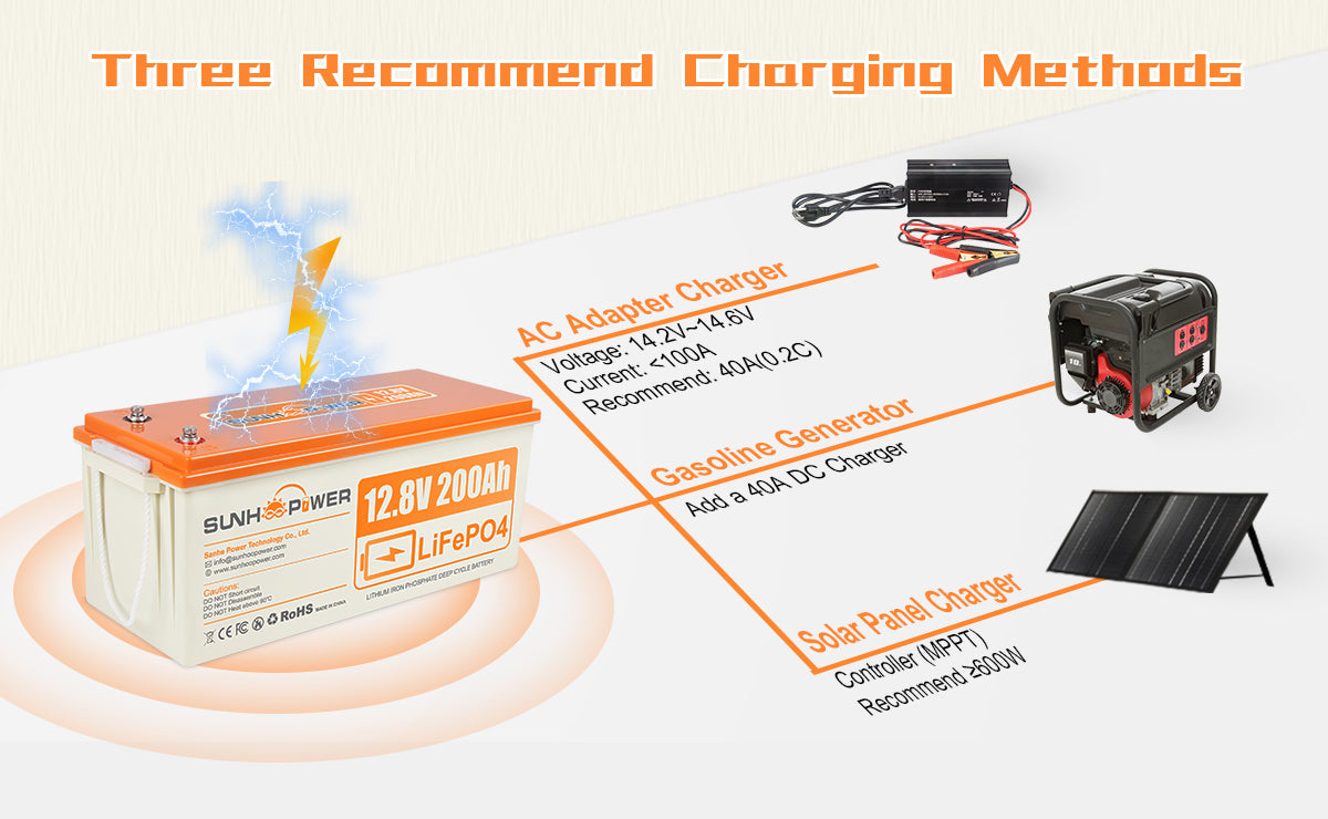 【WARNING NOTICE】SUNHOOPOWER 12V 200Ah LiFePO4 battery is recommended for use with 70~100 lbs trolling motor. LiFePO4 battery is storage batteries and not starter batteries, we do not recommend using the Battery as a starter battery or to power any golf cart, for more info please consult SUNHOOPOWER freely.