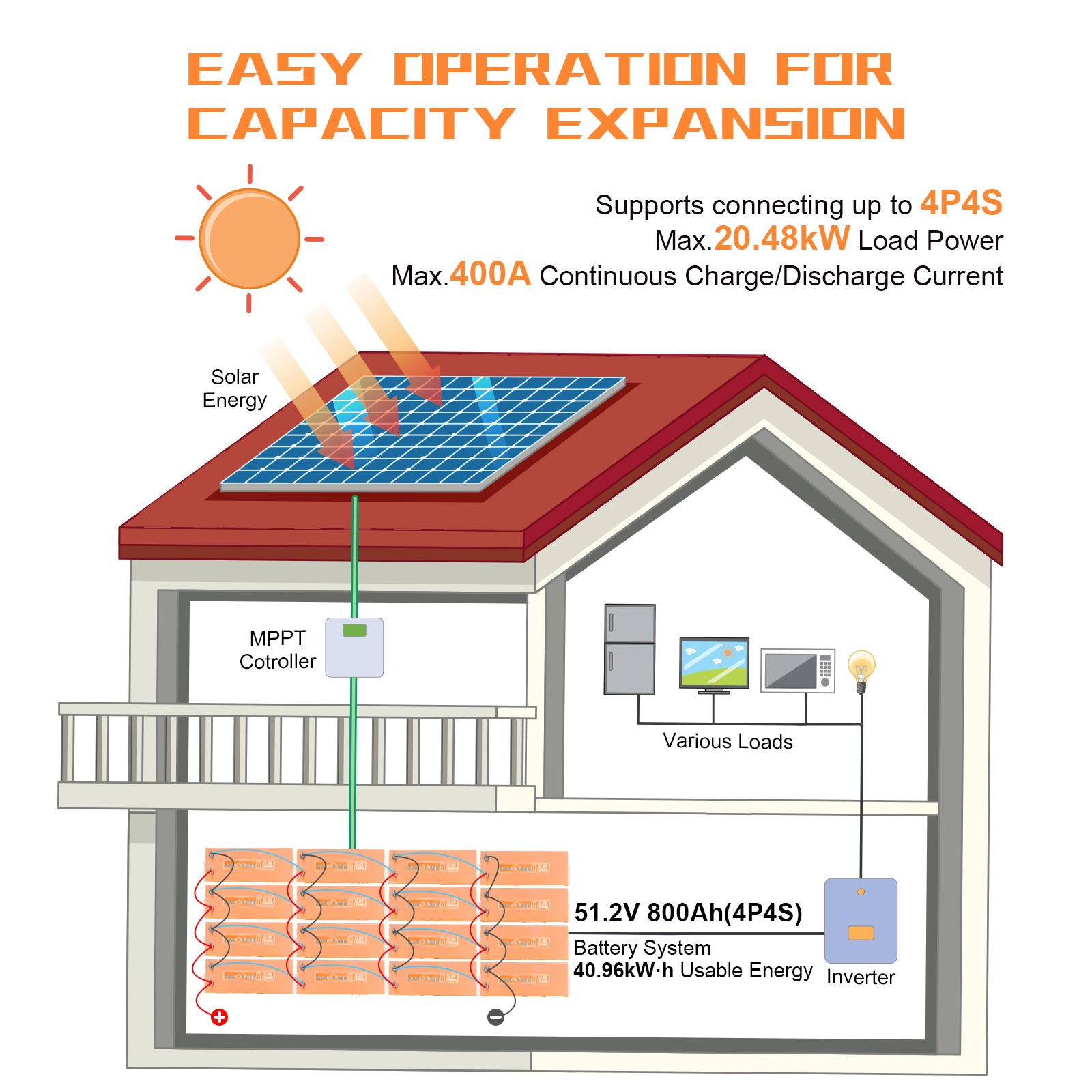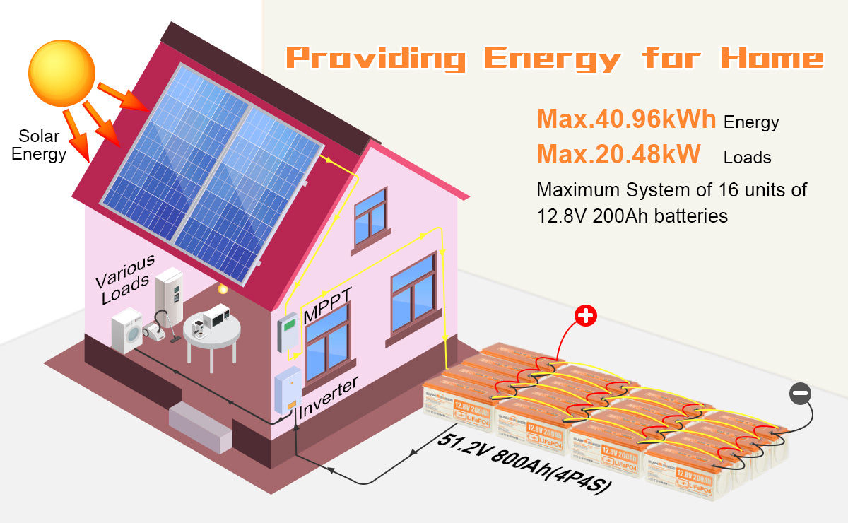 【Capacity Expansion】SUNHOOPOWER 12V 200Ah lithium batteries can be connected in parallel and series for greater capacity and voltage. Maximum Series Capacity: Up to 4 identical batteries can be connected in series, voltage up to 48V. Parallel: Multiple batteries can be connected, it is recommended to connect no more than 4 batteries in parallel. Allows expansion to 4S or 4P for up to 800Ah capacity or up to 48V(51.2V).