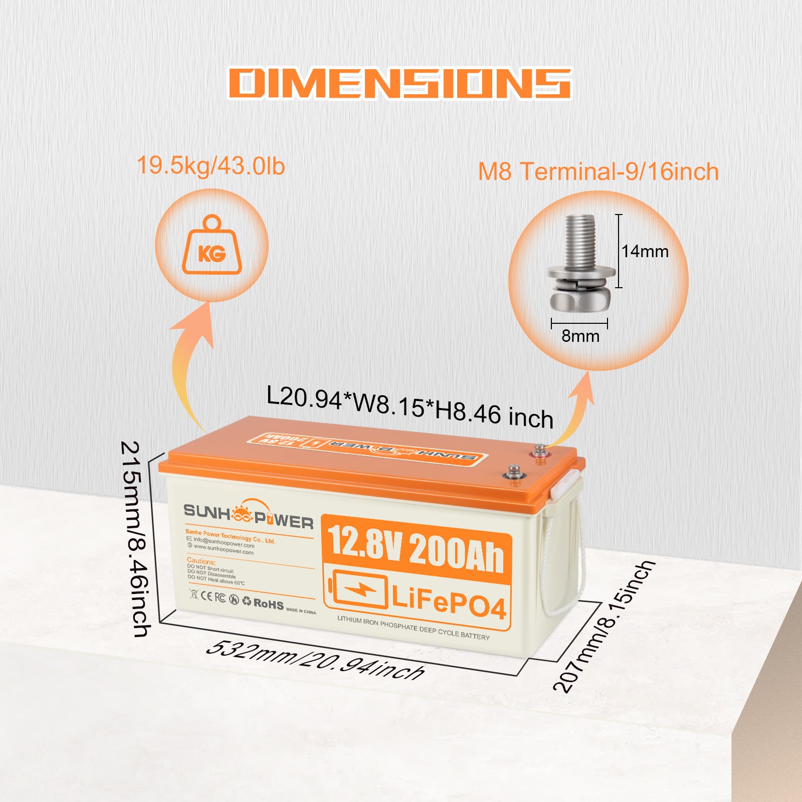 【Extra-Long Life & Lightweight】 SUNHOOPOWER 12V 200Ah lithium battery have a low self-discharge rate, and can be deeply recycled more than 4000 times without failure, while the traditional lead-acid batteries only 200-300 times, the service life of the standard lead-acid batteries 8 to 10 times. 200Ah lithium battery weighs only 43 lbs (19.5kg), 1/3 the weight of lead-acid batteries.